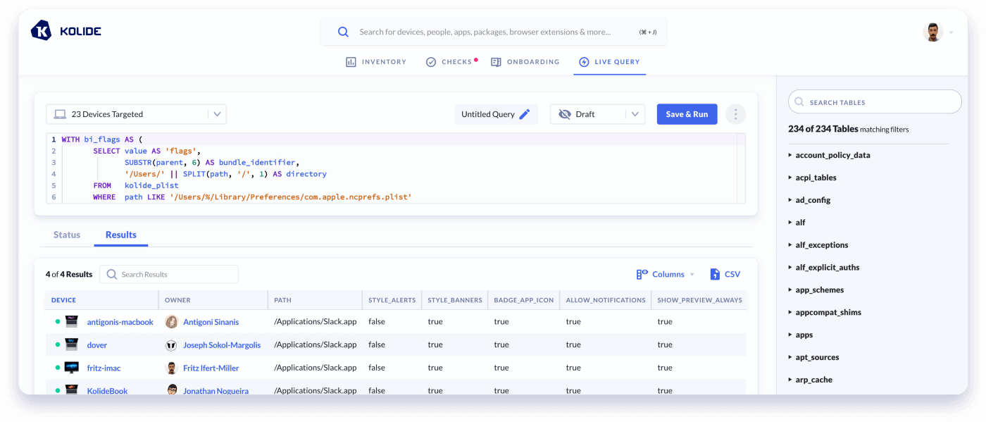 Kolide utilizes osquery to gather device data. Osquery is an open-source, multi-platform, endpoint agent designed to provide device visibility at scale. The osquery agent uses native API’s to gather device data and exposes it in a relational database format which you can query using standard SQL.