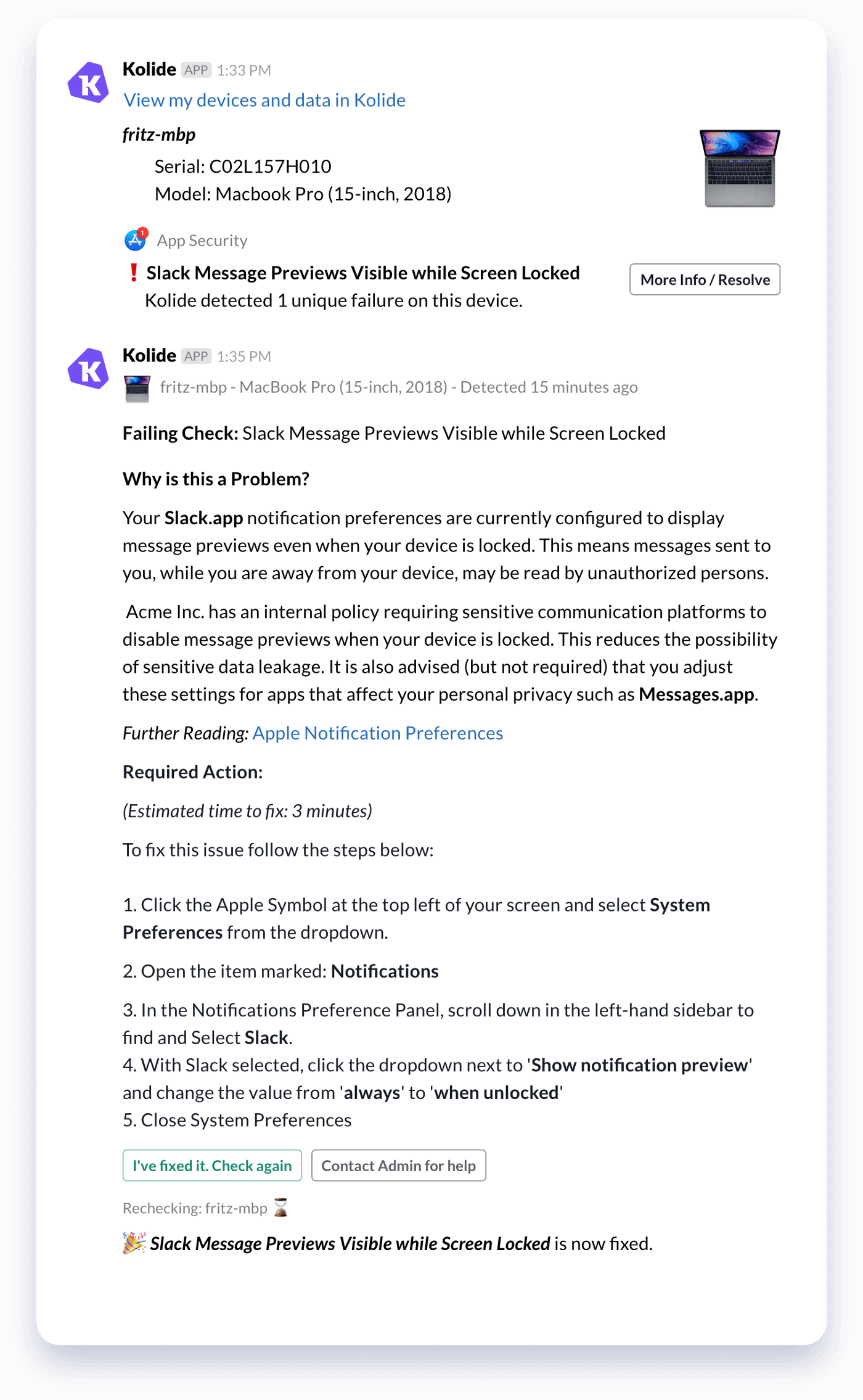 Kolide’s interactive Slack App reaches out to users with self-fix instructions, educating them on their security posture and guiding them through remediation.