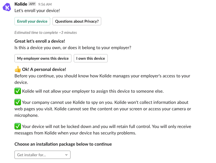 Starting today, when you onboard a new user to Kolide via Slack and enroll a device, they will be asked about the device’s ownership. Based on this selection, Kolide will generate a custom package that will set the device’s ownership mode correctly.