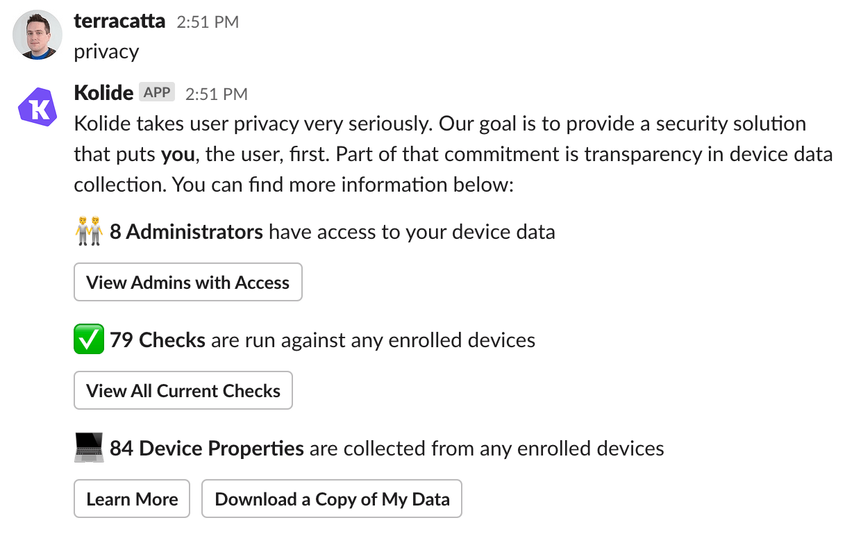 We’ve built this with security in mind. For example, Kolide administrators who sign in to the Privacy Center using one of these magic buttons will still need to authenticate fully when they try to access any sensitive functionality.