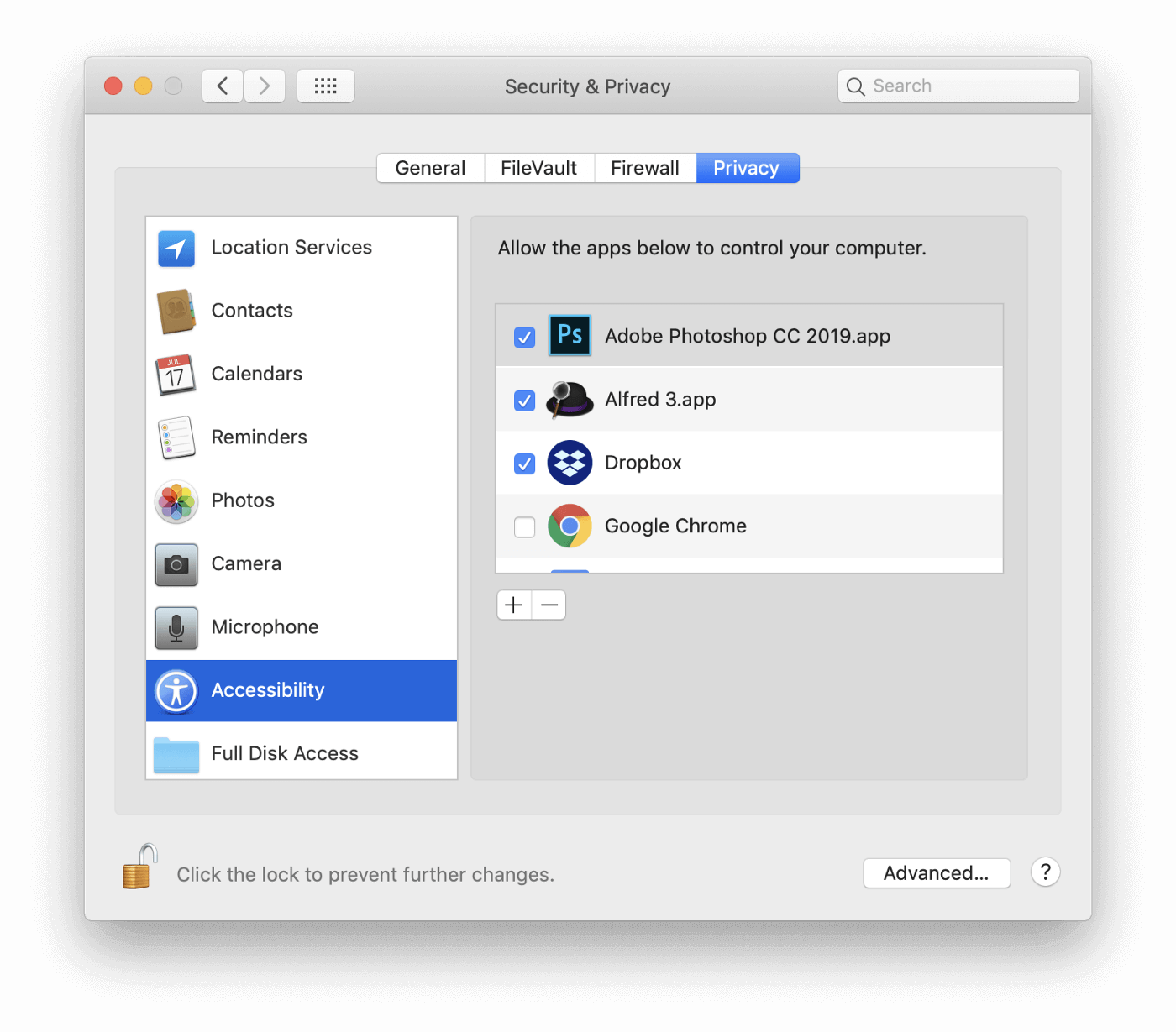- When an application requests escalated privacy permissions a dialog prompt is displayed to the user who can choose whether to allow or deny the application. Afterwards, the app persists in the Security & Privacy preference pane GUI under its respective section. If the app was denied it has an empty checkbox (mapping to 0). If it was allowed it has a checked checkbox (mapping to 1).