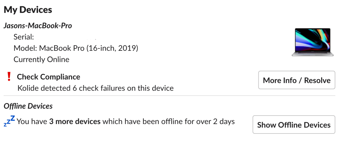 Kolide only sends a failure summary to end-users when their devices are failing checks and only once every weekday to help reduce alert fatigue.