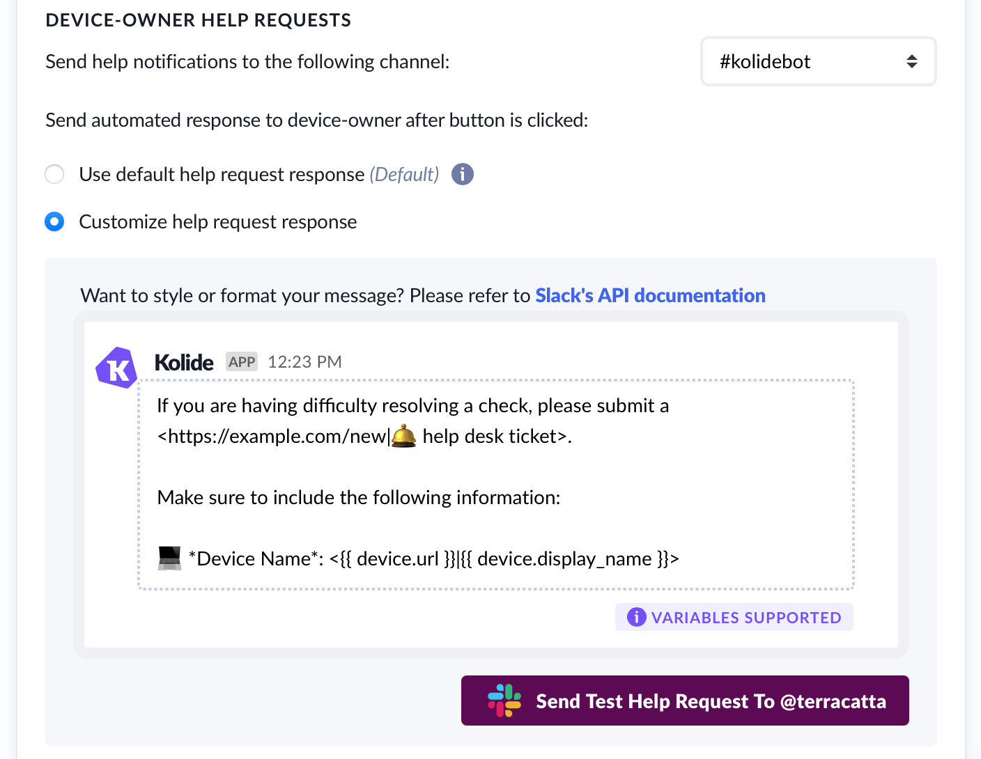 On top of that, we now offer greater customization of the Contact Admin for Help button in Kolide’s Slack message. Admins can customize the reply we send users when this button is pressed, allowing for internal guidance — like how to submit an IT ticket. Messages can even include dynamic information from the notifications the end-user escalated!