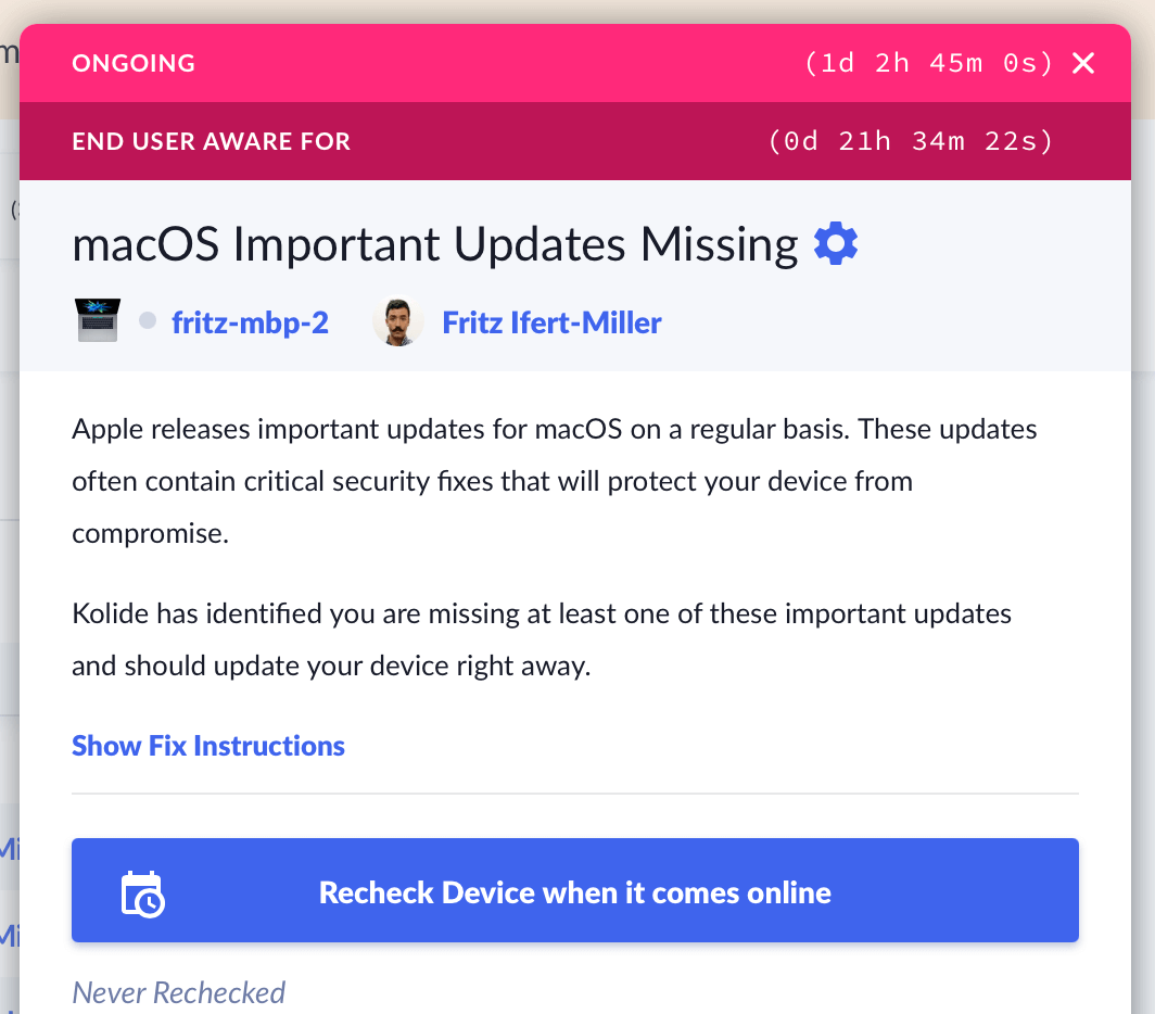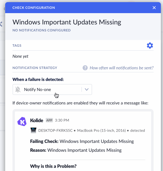 For many Checks, this is desired; Kolide has caught a serious problem, and you want to let the user know about it quickly. Sometimes though, this approach can feel a bit punitive. For example, if Kolide detects a Windows device is missing an important update that was just released, you may want to give the user at least a few days to take care of the problem before triggering a reminder.