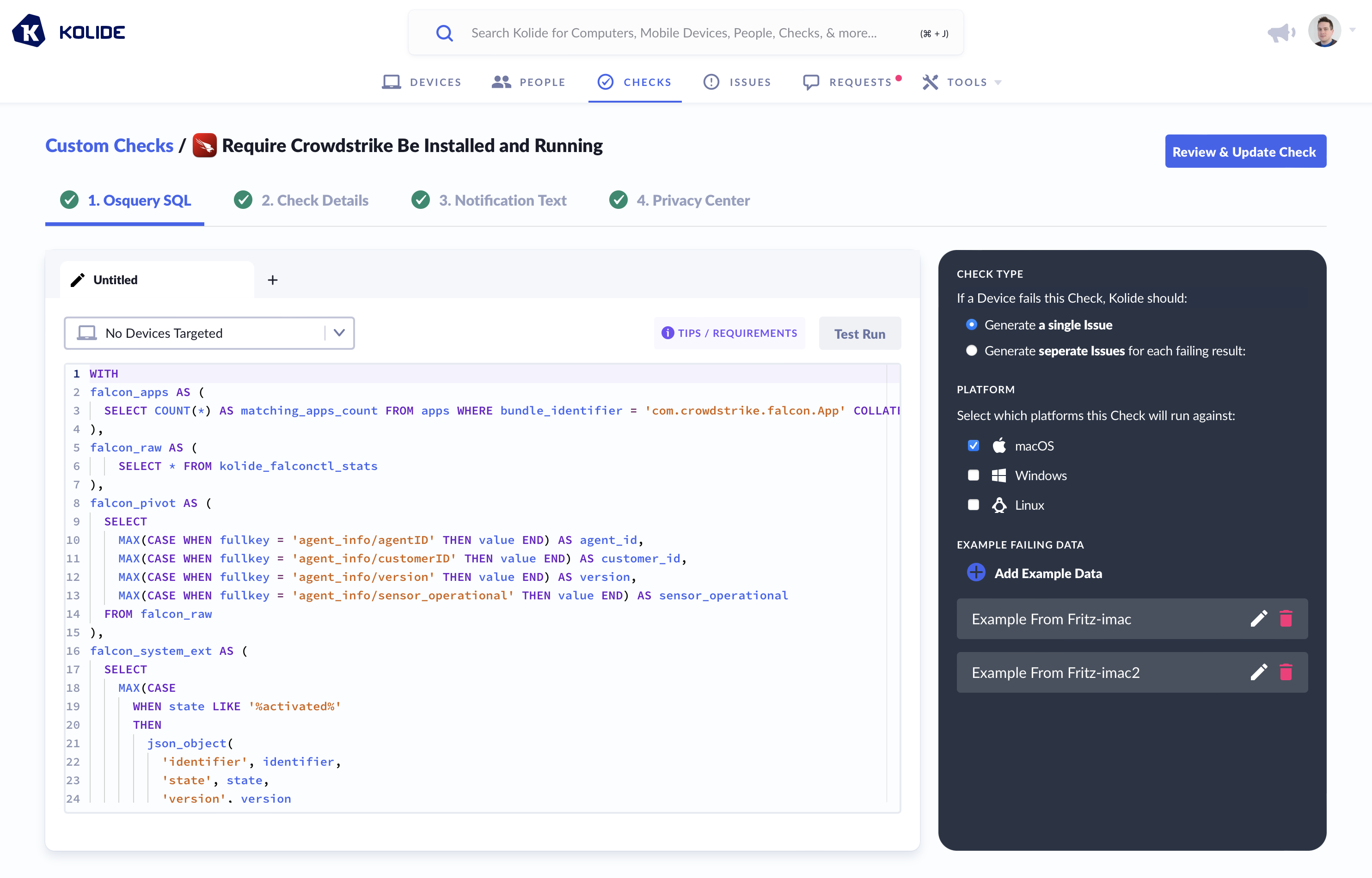 An example of Kolide’s Custom Check editor showing the Crowdstrike Check which can detect the presence of the software and even ask it to confirm its sensors are operating correctly.