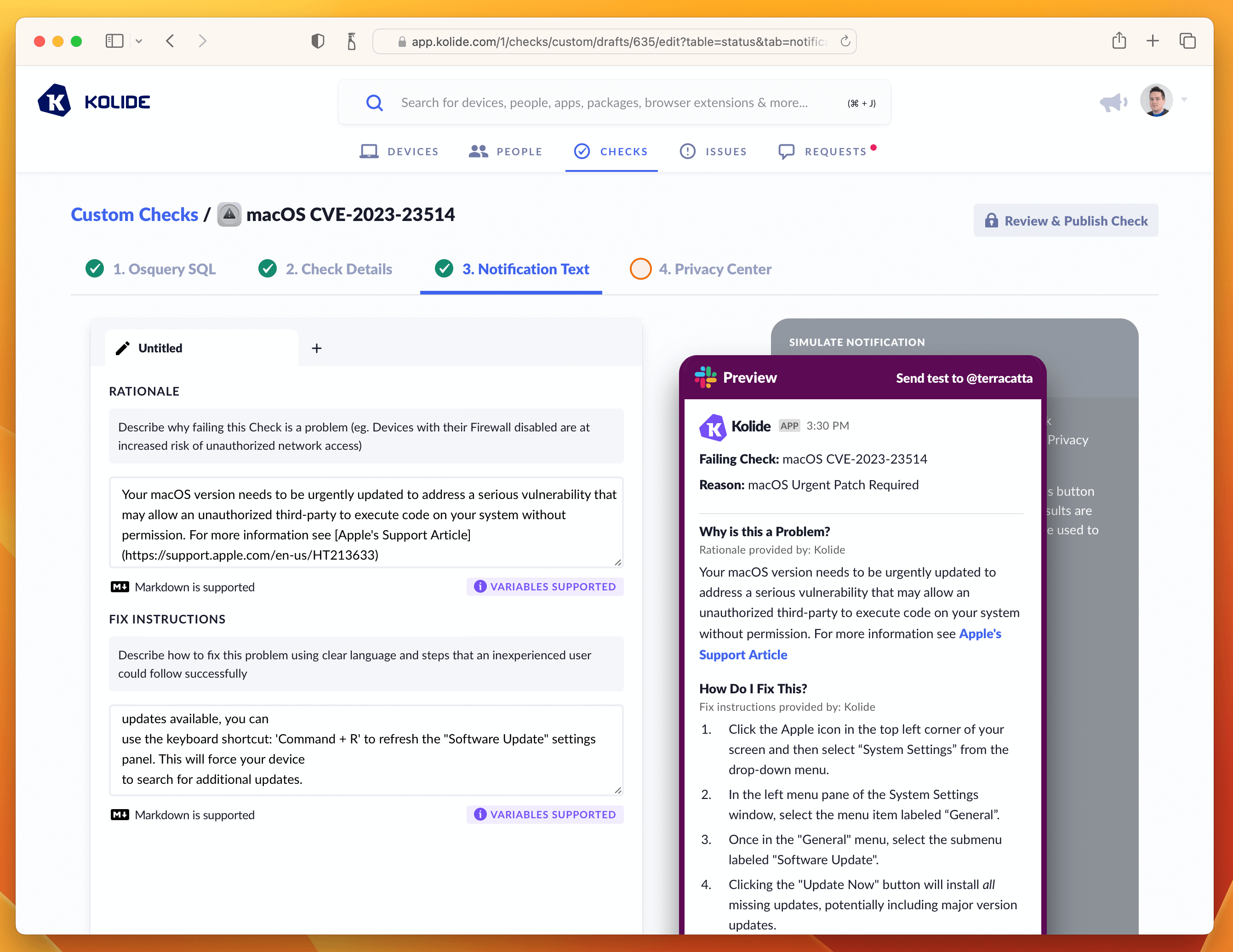 As shown above, when using Liquid, you can alter the instructions Kolide sends to the end-user based on the data from a failing check. To ensure your template functions correctly, utilize the Simulate Notification sidebar to modify the check data used in rendering the preview.