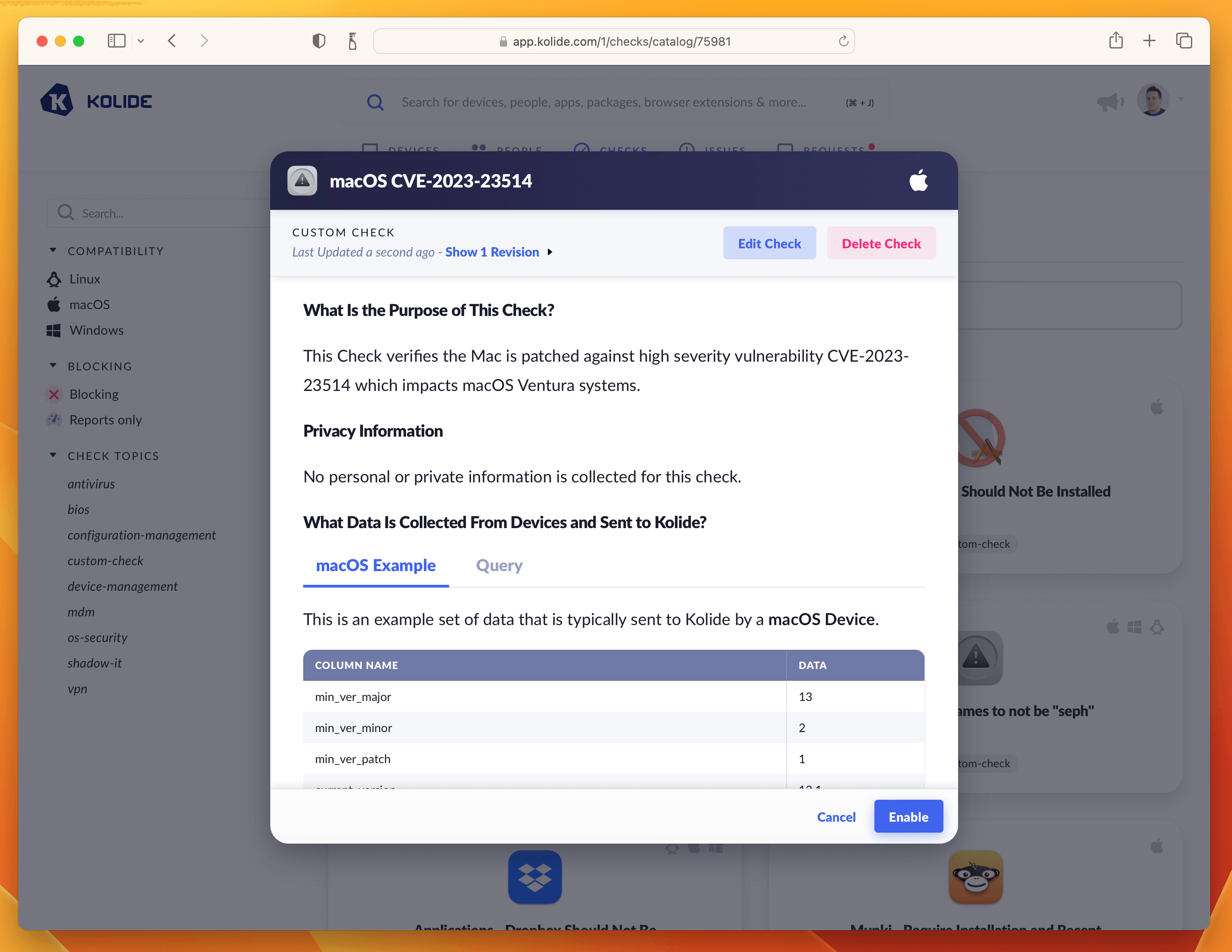 Kolide enables you to use the power of osquery to define your own fully custom Checks. To best explain this capability it helps to walk through a complete example.