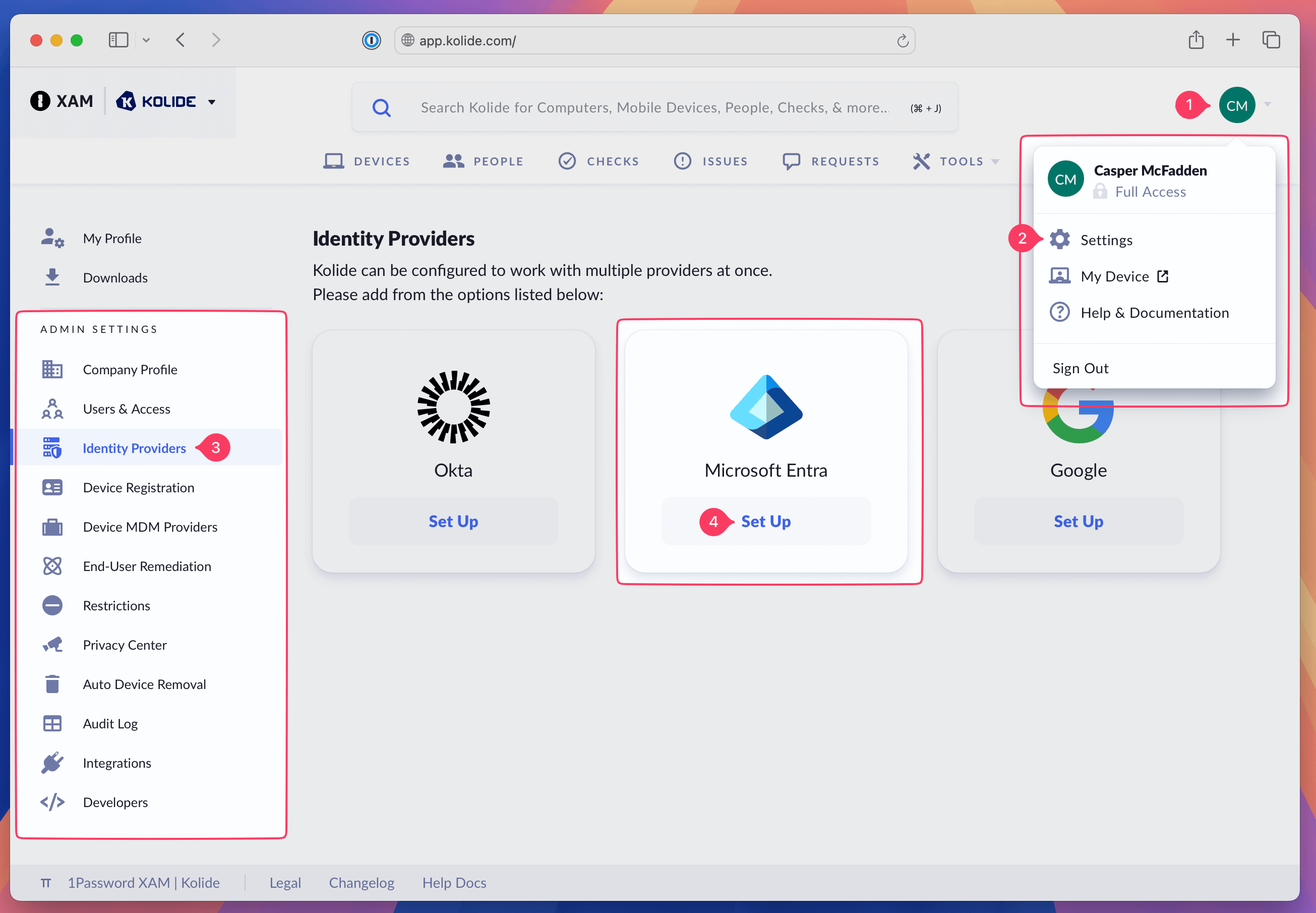 - Protect the 1Password Device Trust (Kolide) admin dashboard with Entra authentication.