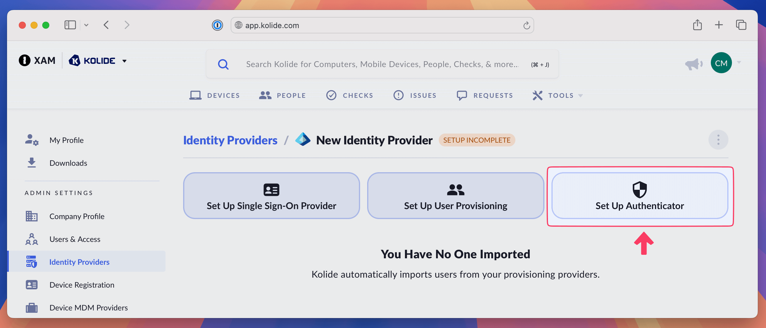 - In Kolide, choose Set Up Single Sign-On Provider.