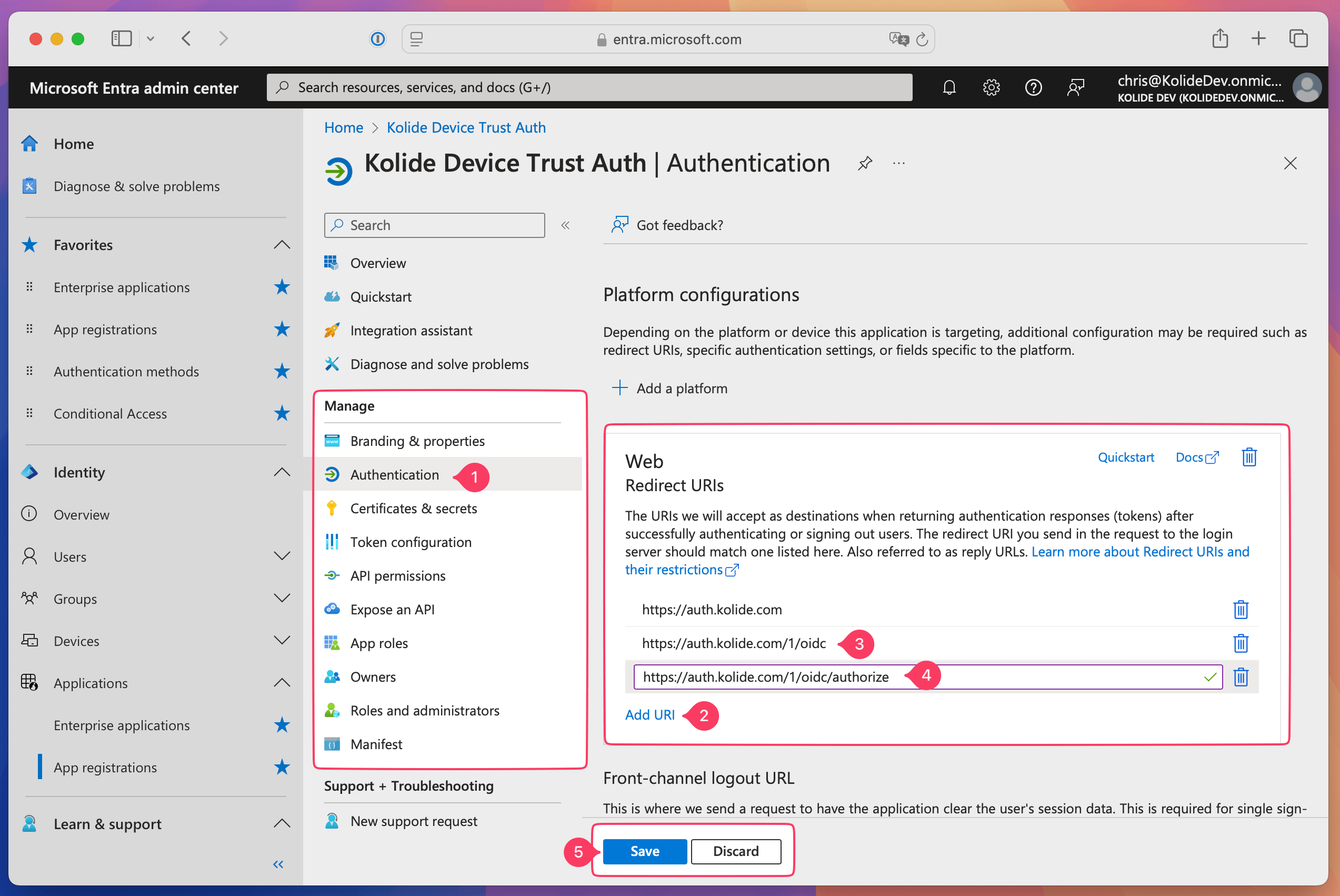 - In Kolide, copy the Authorization URL and paste it into the third Redirect URIs field in Entra ID.
