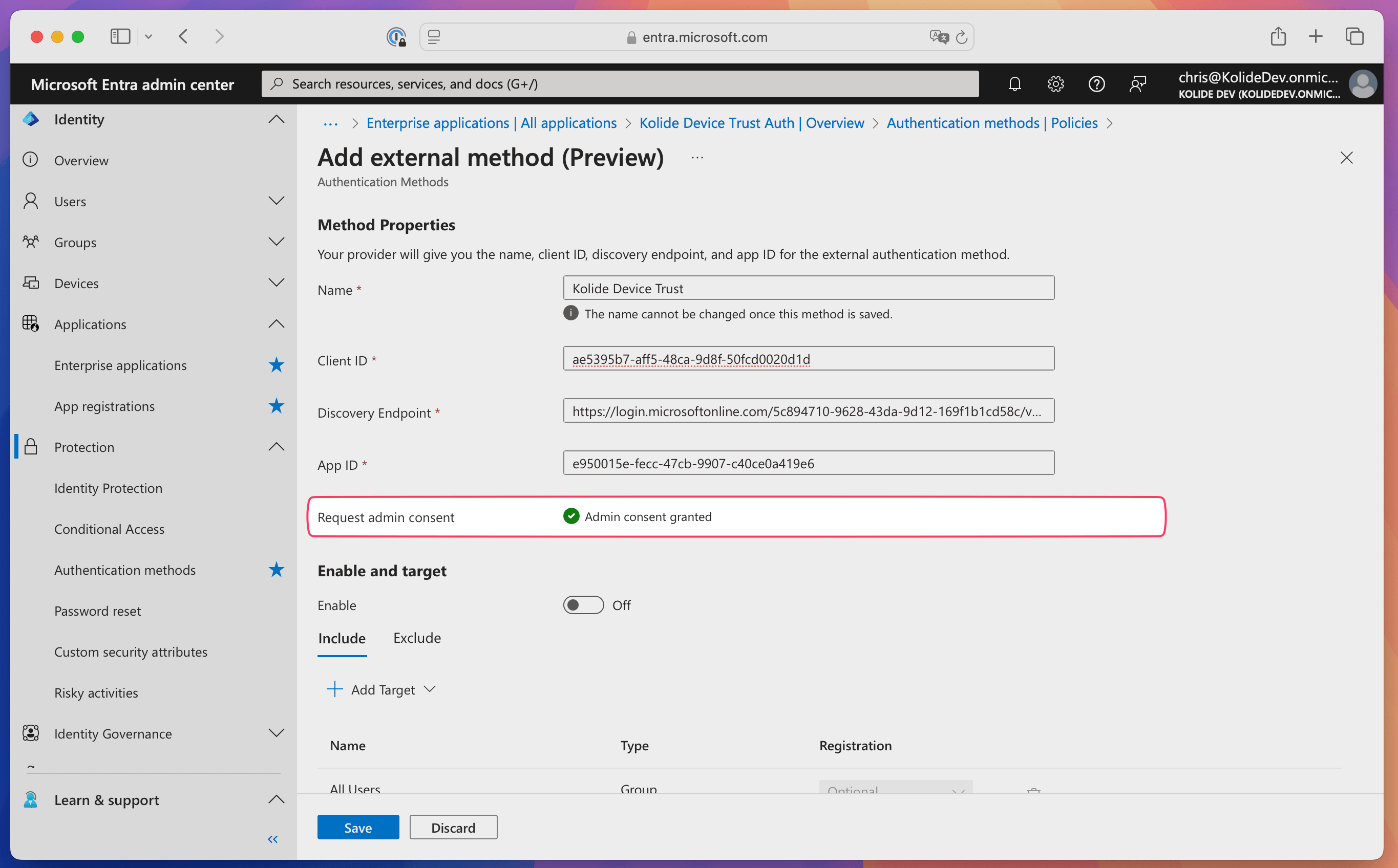 - After admin consent is granted, toggle on Enable in the “Enable and target” section.