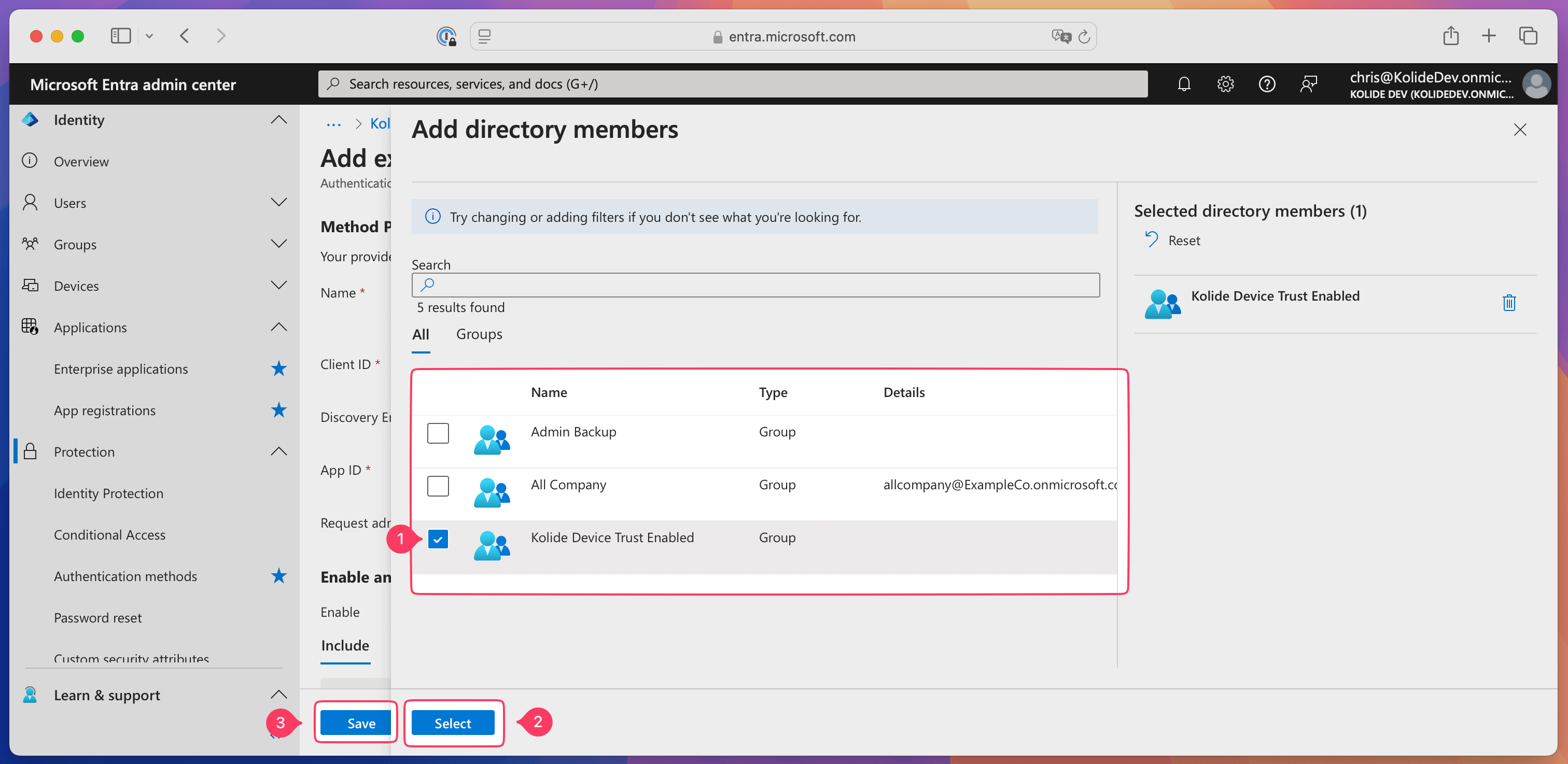 - Find and select your Kolide Enabled group and choose Select at the bottom of the page.