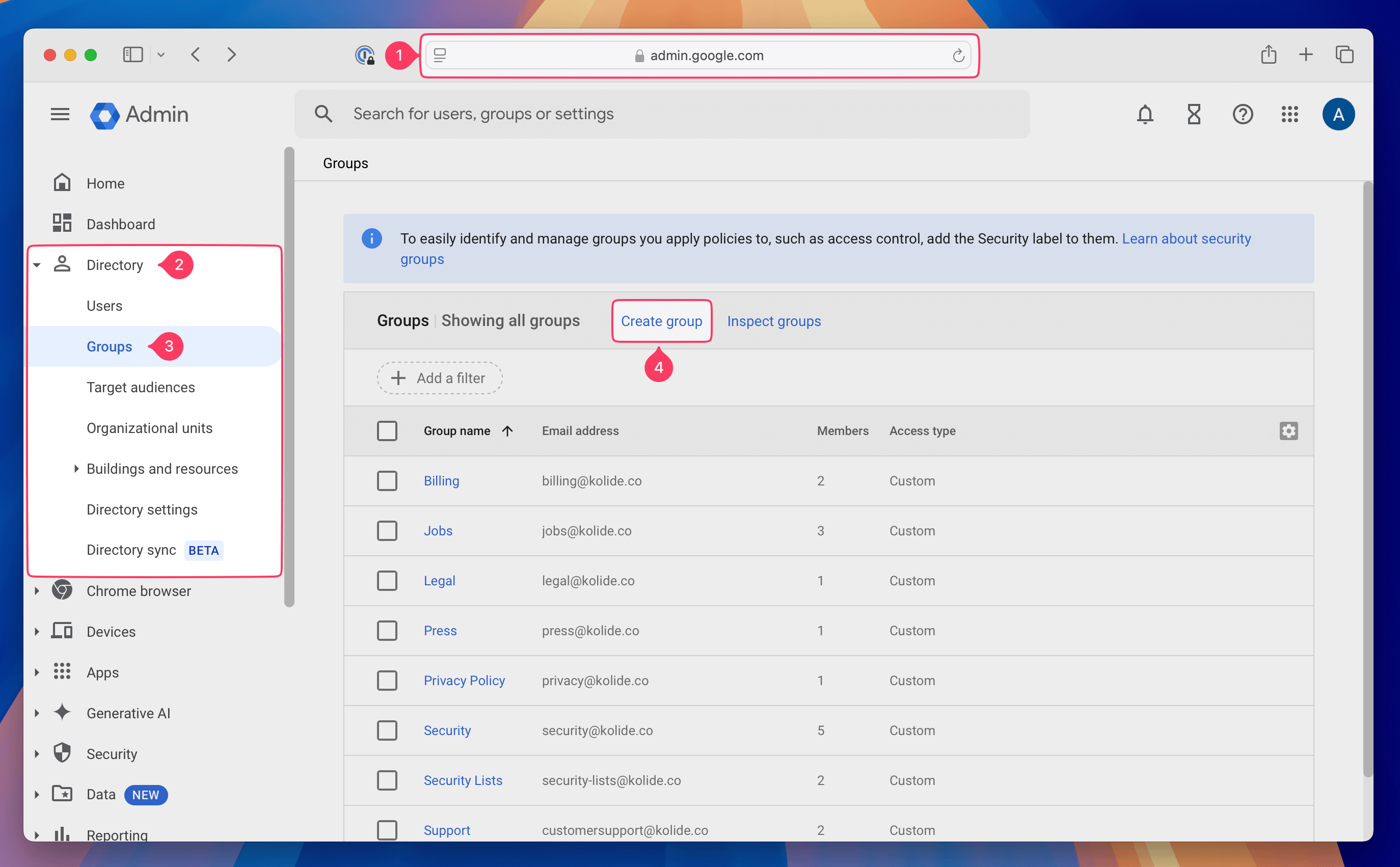 - In the Google Admin console, select Directory > Groups in the sidebar.