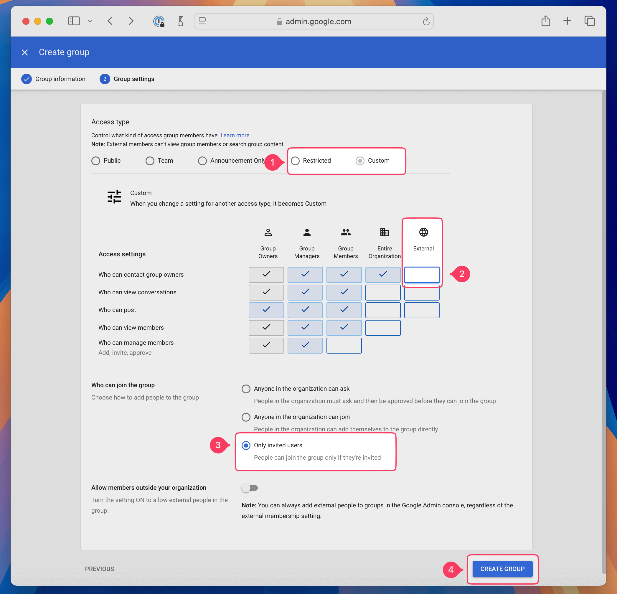 - In the Google Admin console, in the “Who can join the group” section, select Only invited users.