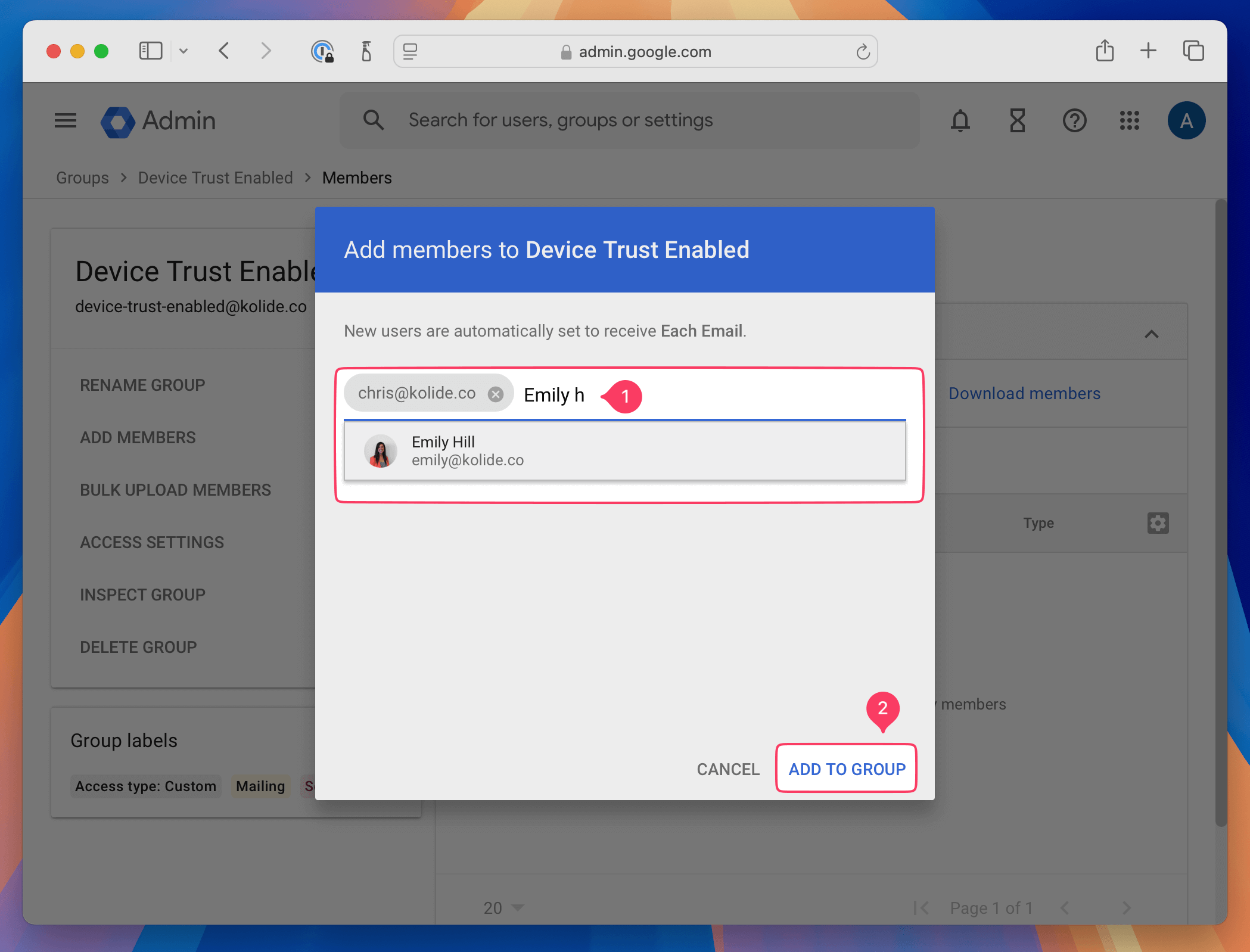 - In the Google Admin console, select Add members to Kolide Enabled.