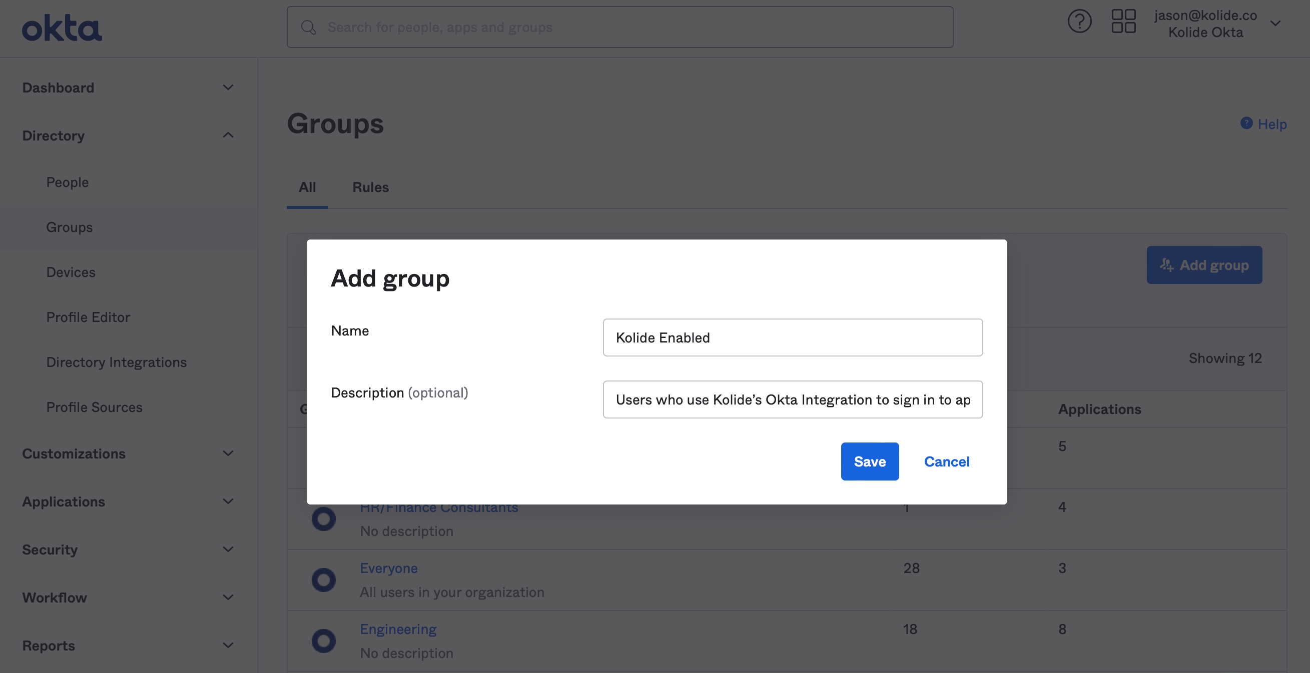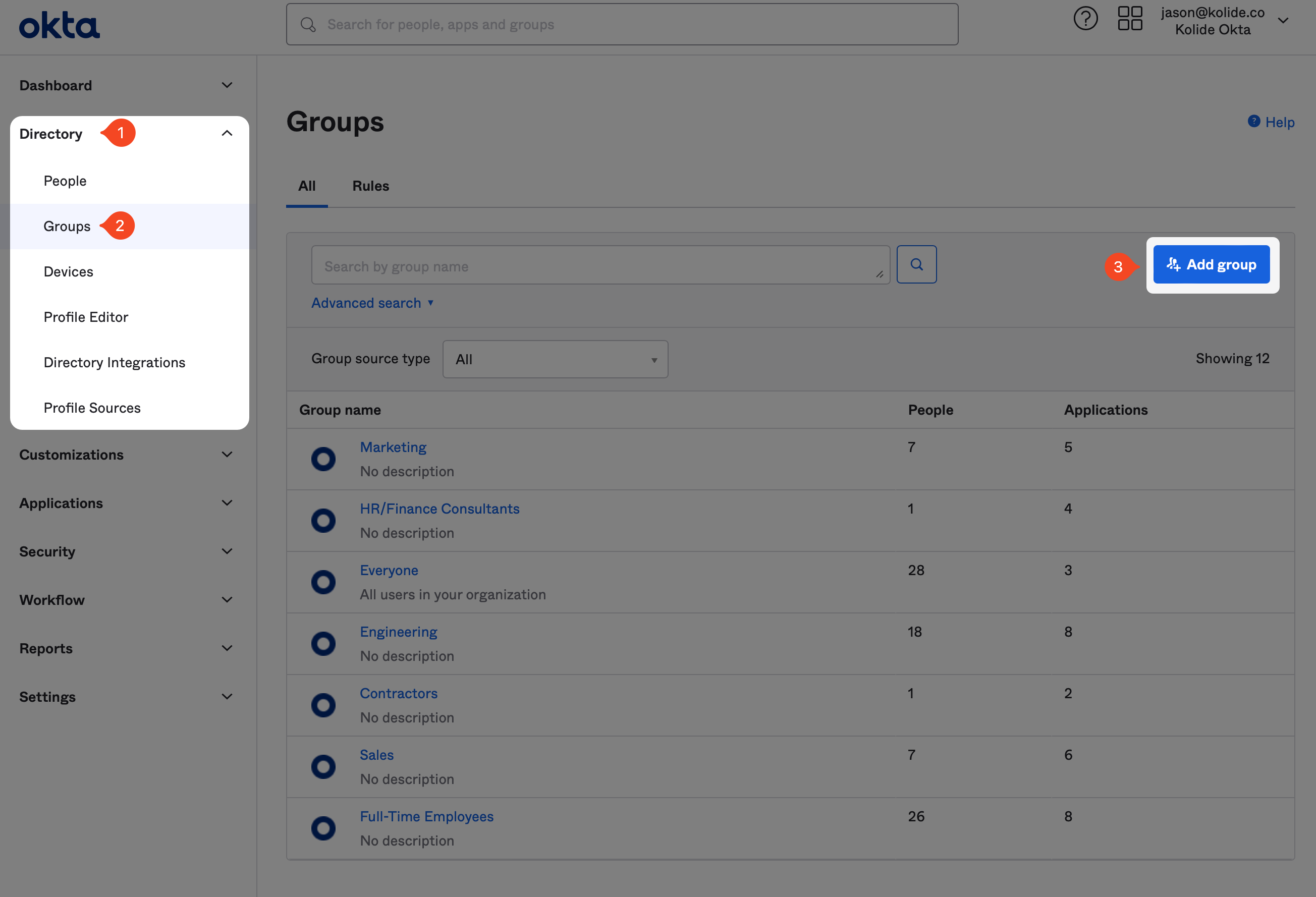 - In the sidebar of your Okta administrative portal, select Directory, then choose Groups.