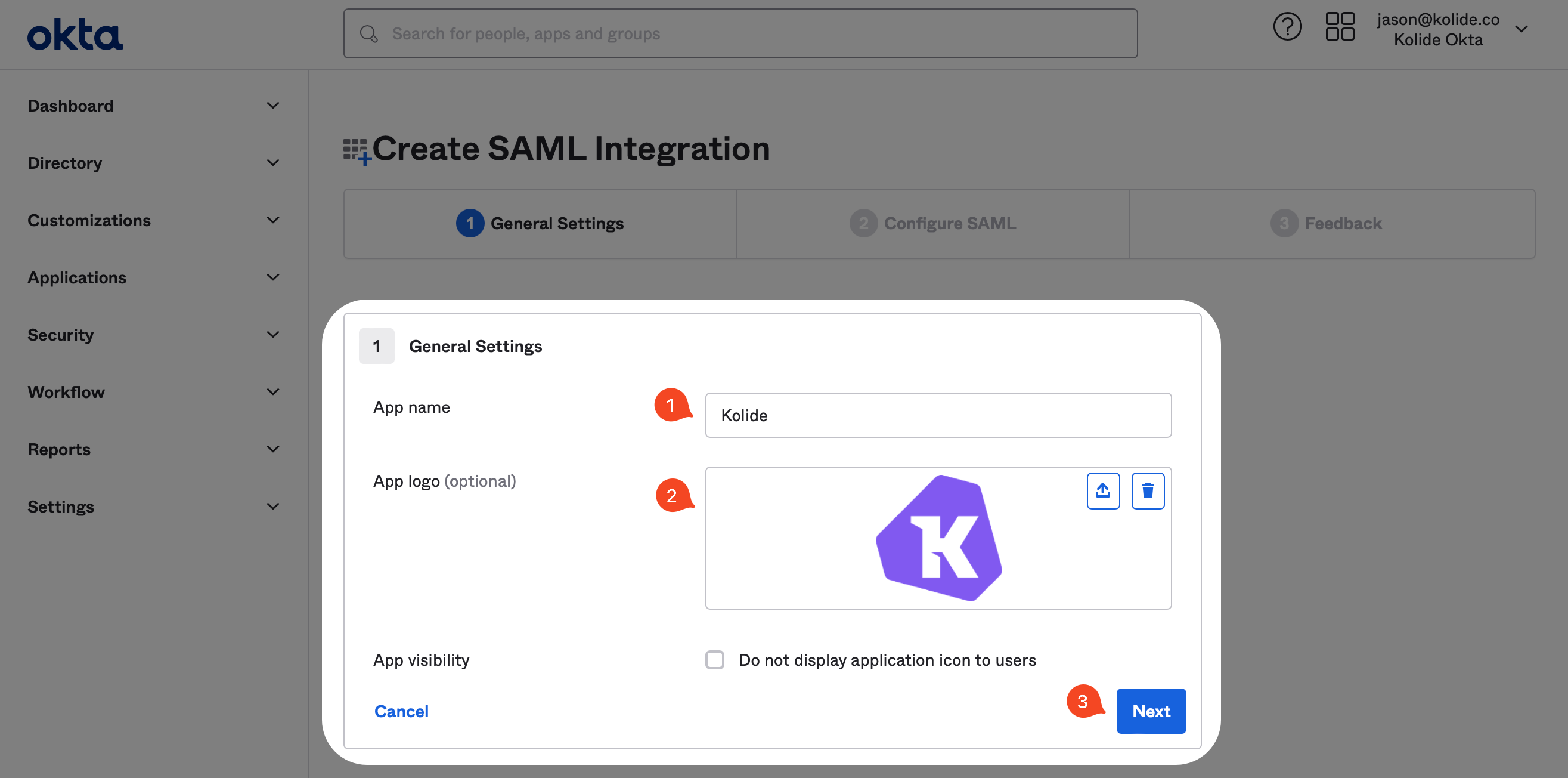 Kolide SSOas the name, then download this image and upload it as the logo. - Leave Do not display application icon to users turned off, then select Next.
