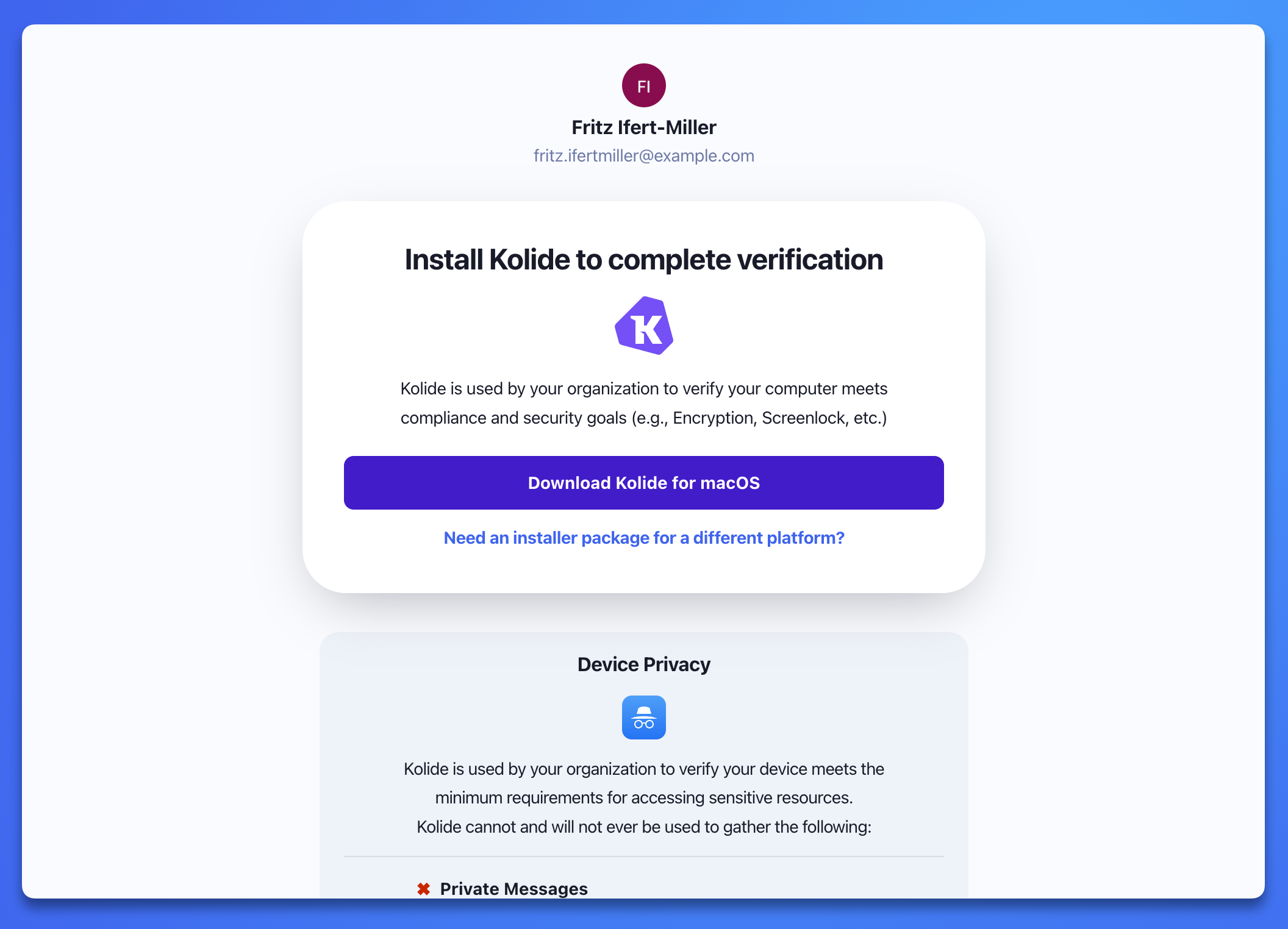 If you’re deploying the Kolide agent without an MDM, your team members will be prompted to download and install the agent, and register their device when they attempt to sign into an app protected by Kolide.