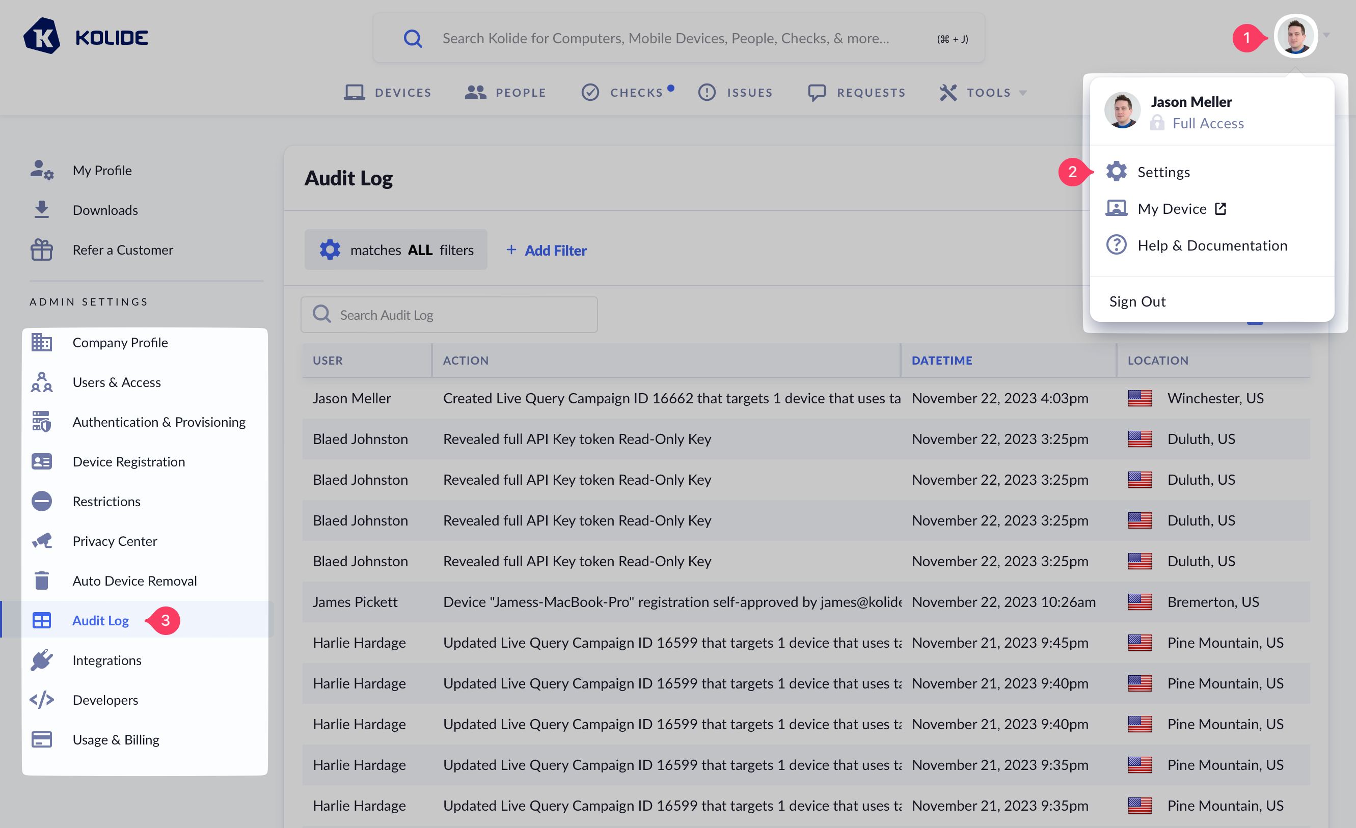 Only admins with “Full Access” can access the Audit Log in the Kolide UI.