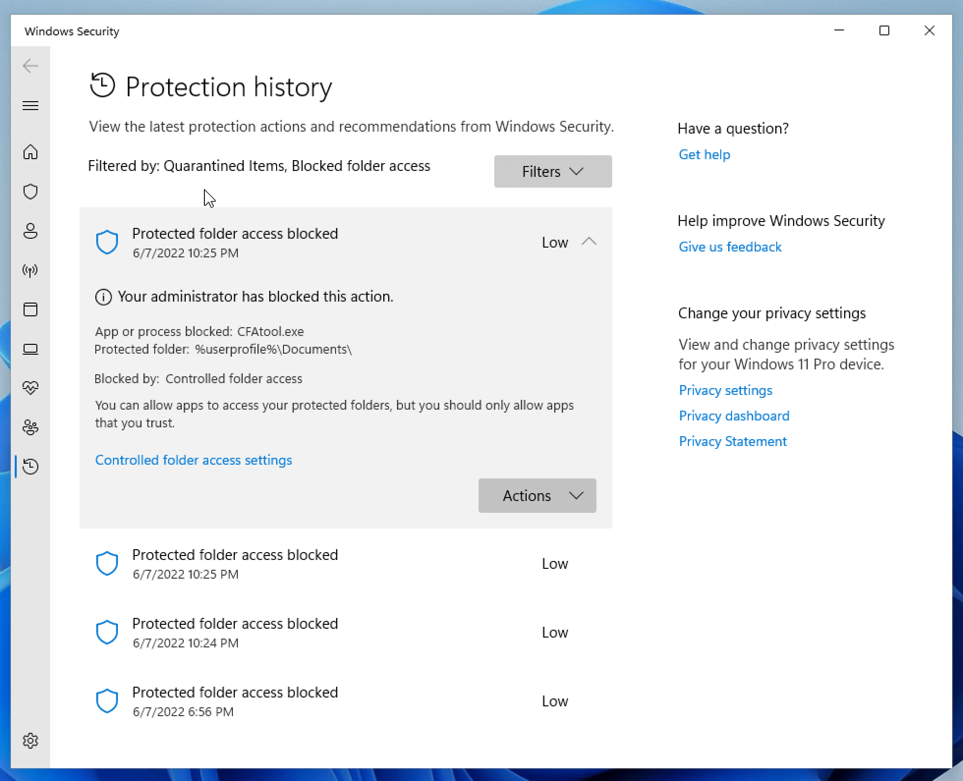 You can review these notifications in more detail from within the Protection History section of the Windows Security control panel.